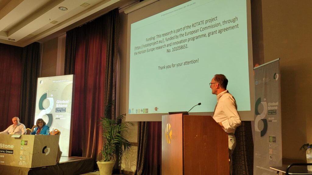 The Technological Centre for Mineral Raw Materials and Materials (CTM), one of our partners at ROTATE, participated in the Global Stone Congress 2025, held in Drama (Greece) from 16 to 20 June 2025. One of our presentations at the Congress focused on showcasing the results of valorizing mining sludge in construction applications through additive manufacturing. This work was carried out within Task 4.2 of the European ROTATE project, which uses these residues as raw material to produce micro-concretes.